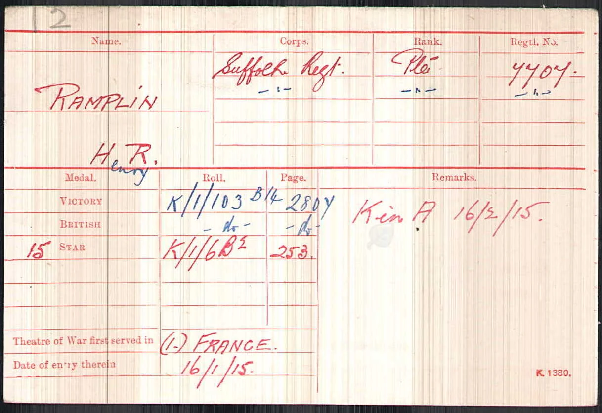 The regimental history reflects that the fighting in February 1915, “though costing the Battalion eleven officers and three hundred other ranks was not of sufficient importance to be included in the official list of the battles and engagements of the Great War.” Such was the significance of this one engagement in the enormity of the Great War. Private Ramplin, whose full name was Henry Richard Ramplin, was born in 1891 the son of Frederick and Eliza of 33 New Cut. He enrolled in the Suffolk Regiment in about 1908 and saw something of the world, being around the Mediterranean at the time of the 1911 census. It is thought that he had left the army by 1914 but was still part of the Reserves and was mobilised at the start of the war and transferred to 1st Suffolks as they entered the conflict.