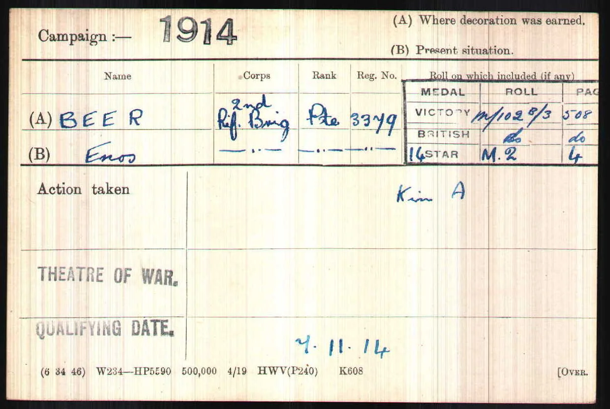 Enos Ephraim Beer was awarded the 1914 Star and as his body was never identified, he is commemorated on the Ploegsteert Memorial.