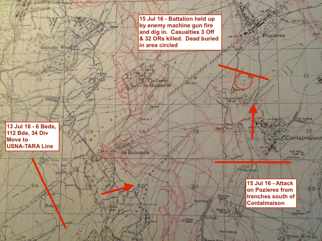 15 Jul 1916 [The Battle of the Somme - the Battle of Bazentin] Attack on POZIERES by 112th Bde. from trenches S. of CONTALMAISON, Bde. held up by hostile machine guns, established itself about 100 yds from the lisiere [100 yards north of the edge of Contalmaison Wood] & dug in. Casualties (3 Offs Killed, 32 O.R. Killed) (25 missing) (9 Offrs. Wounded, 174 O.R. Wounded).